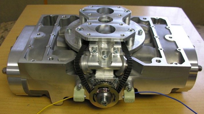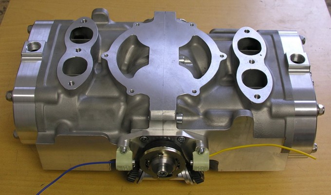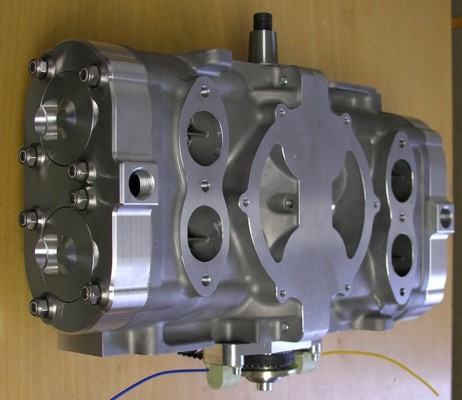 Replica of 700cc König square block motorbike engine. Exhaust down and inlet ports on up positions. Heads has inserted chambers and threads can be straight or oblique positions. Heads and chambers are sealed with rubber o-rings only. Optional rotary valve can be used with Weber or Solex type carburettors. Water pump and water sump can be added on request. Water outlets pipe threads 1/2". |