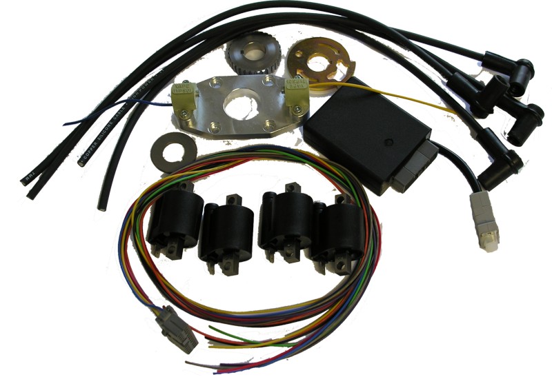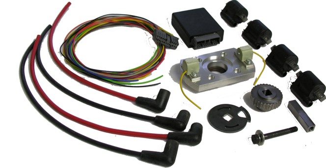 Complete ignition including: Ignition box, ignition plate, 2 pickups, 4coils with high voltage cabels length 0.5meters, flywheel, tooth gear, wire harness length 1 meter, washers or square shaft.